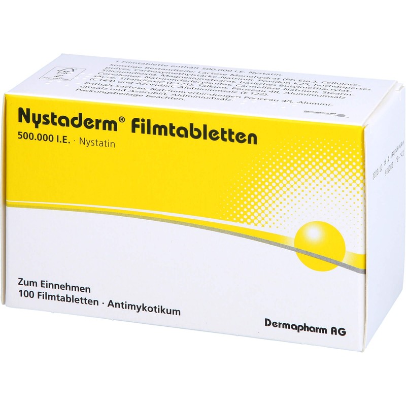 Ingredients: active ingredient per 1 tablet: 50000 IU NystatinOther ingredients: lactose 1 water, cellulose powder, carboxymethyl starch sodium, povidone K25, highly disperse silicon dioxide, magnesium stearate, alkaline butyl methacrylate copolymer, sodium dodecyl sulphate, carmello. se-sodium Stearic acid, titanium dioxide, talc, ponceau 4R aluminium salt, azorubin aluminium salt; usually 1-2 film-coated tablets are taken without chewed with a little liquid after meals. If medically ordered, the dose of Nystaderm can be used film tablets increased .