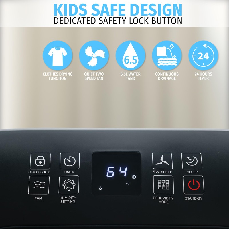 • AUTOMATIC SAFETY FEATURES: When its 6.5L / 1.7 Gallons tank is full, the dehumidifier automatically shuts off for safety. This feature ensures hassle-free operation without the risk of overflow. Moreover, the machine boasts an automatic defrosting function, enhancing its efficiency and lifespan.