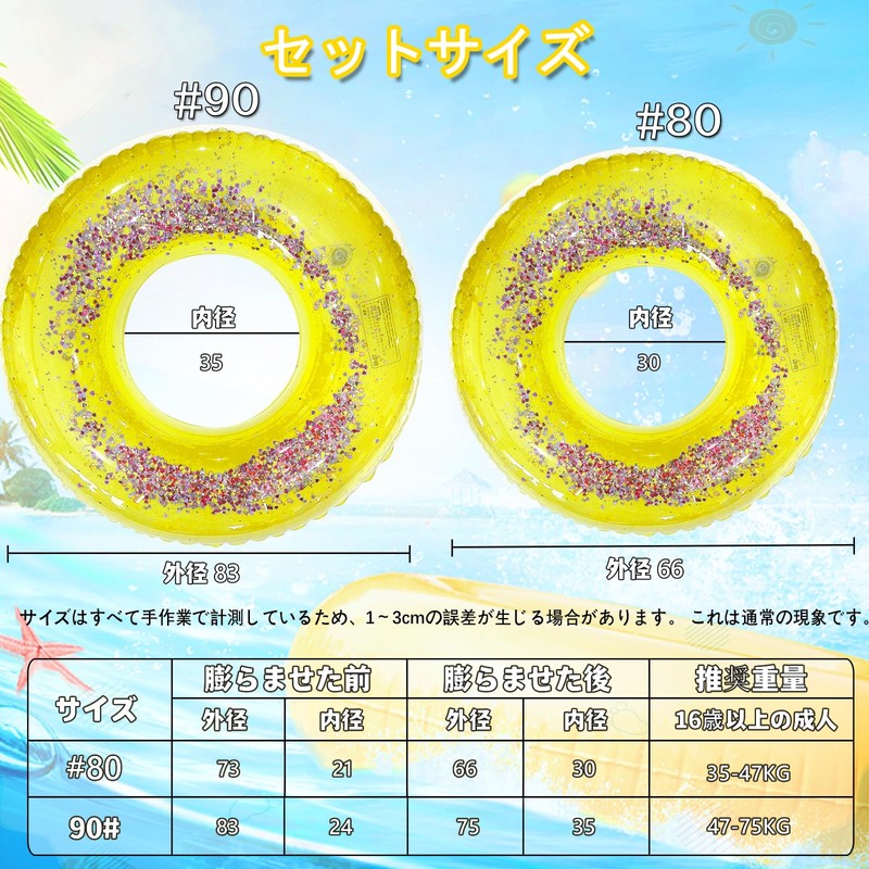 - 🌈【キラキラデザイン】浮き輪の表面には、光沢のある装飾が施され、カラフルな色が組み合わさっており、オシャレで目を引く外観です。日光の下ではそのキラキラとした光沢が、水中で周りの人たちの注目の的となります。