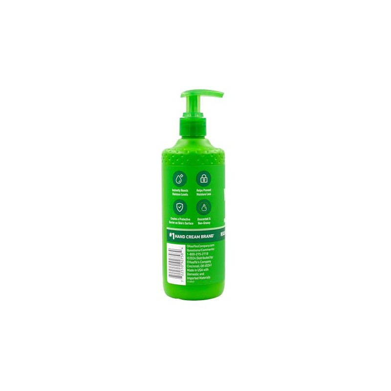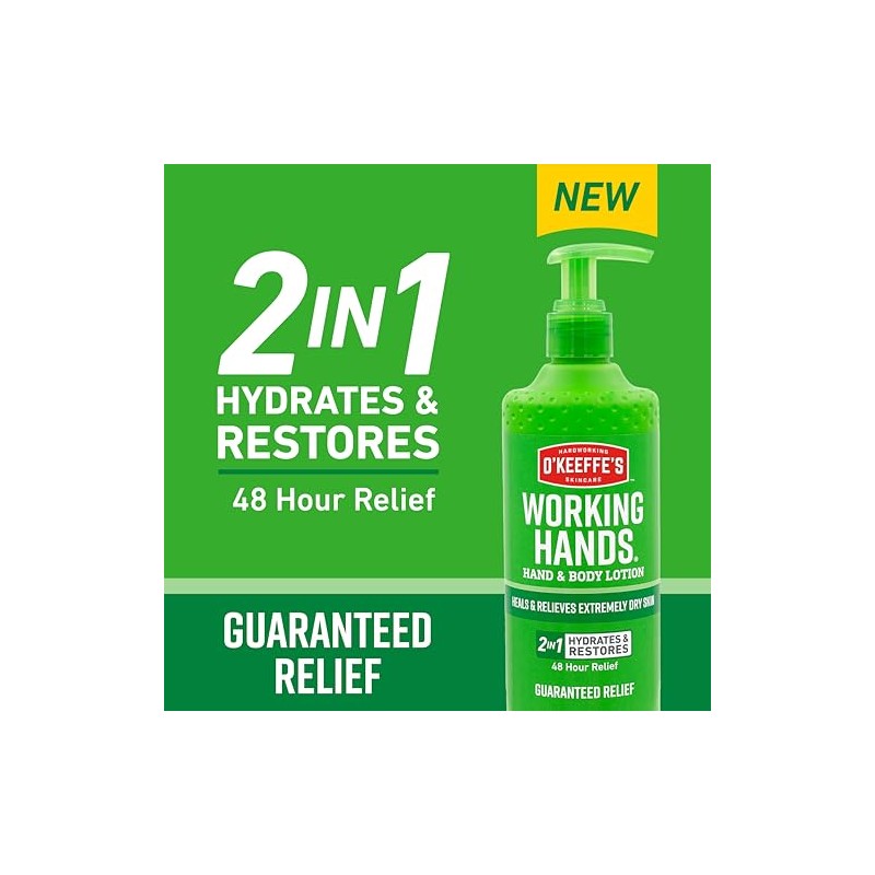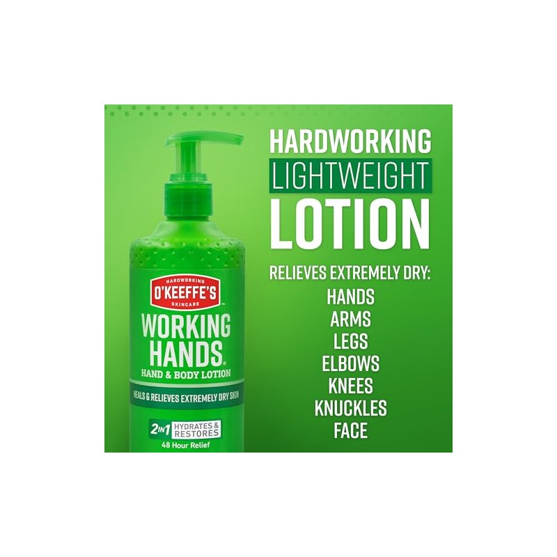 O'Keeffe's Hand and Body Lotion is a hardworking formula that creates a barrier on the skin's surface that locks in moisture and keeps your skin hydrated.This concentrated, highly effective hand and body moisturizer heals, relieves and repairs extremely dry, itchy skin. When Used Daily, O'Keeffe's Hand and Body Lotion is clinically proven to: Provide instant relief, Moisturize and protect against dryness for 48 Hours, Help prevent flare ups associated with dry, itchy skin.Ideal for dry skin problem areas such as elbows, knees, heels, and knuckles. Use daily to keep your hands, body, and face moisturized.GUARANTEE: If you are not fully satisfied, we will refund 100% of the purchase price. Please retain product and call 1-800-275-2718 for replacement product or refund.Directions:Apply to dry skin as often as needed.To Unlock the Pump:STEP 1: Before trying to open the pump, first ensure the lid is fully tightened. Sometimes a loose lid makes the pump feel stuck when it's just not secure. Twist the lid tightly clockwise until it won't turn anymore.STEP 2: Turn the pump head counterclockwise by an approximate quarter turn while holding firmly onto the neck of the bottle. You should feel it slide into the open position and stop at a point, but it will not pop up.STEP 3: The pump should now be in the unlocked position where you can depress the pump to dispense the product.TIP: To lock the pump for travel, turn the pump head clockwise.