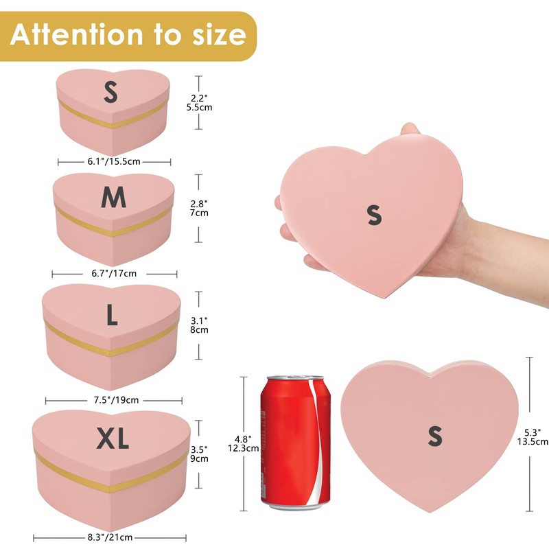 - 【Pracical Nesting Gift Boxes】: The pink heart shaped boxes can be widely applied at home or store, which can be packing mini bouquets, chocolates,candles, watches, jewelry, candy, small clothing accessories, gift cards, homemade crafts, cookie or cake. You can fill some colorful shredded crinkle paple into your pink gift boxes and tie with ribbons or twine to DIY your unique gift box