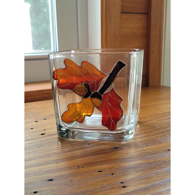 Oak Tree Leaves and Acorns Hand Painted Stained Glass Candle Holder Fall Thanksgiving Home Decor