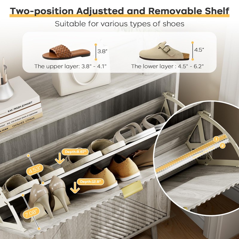 - 【Hidden Shoe Cabinet】: This shoe cabinet is equipped with 2 flap doors, with a stylish and simple grey panel with gold handles. The fluted panel design of the flap doors highlights exquisiteness and uniqueness, suitable for various home styles. It is very suitable for the entrance, corridor, living room or porch, making your home look neat and orderly while saving space. 【ATTENTION】: THE SHOE CABINET MUST BE FIXED TO THE WALL TO PREVENT IT FROM TIPPING OVER AND TO ENSURE SAFETY!