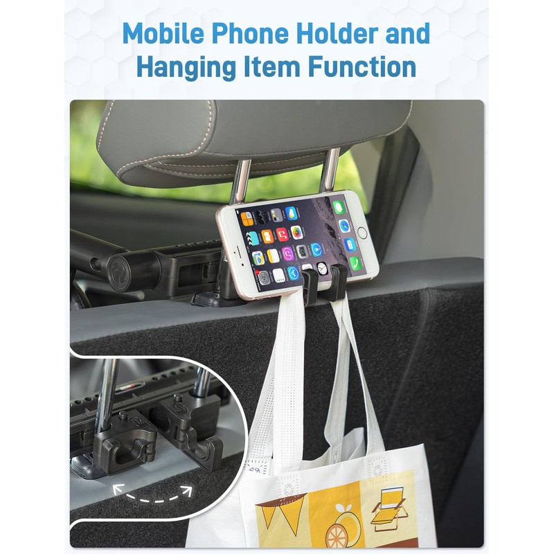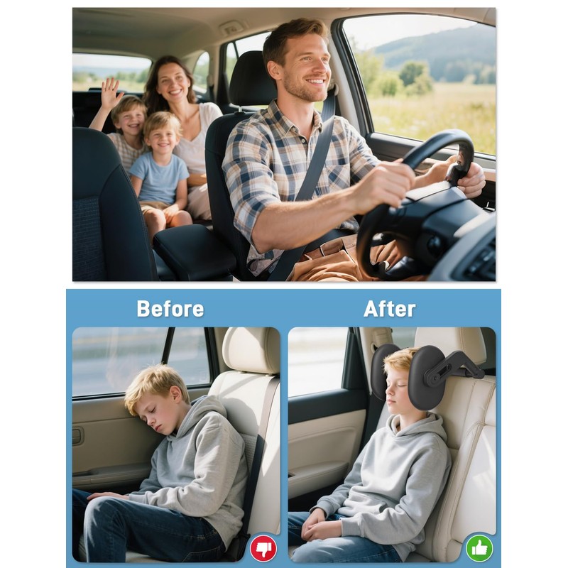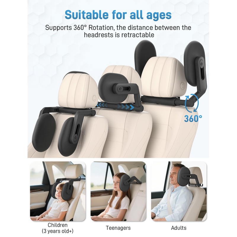 - 3. Space-Saving and Easy Storage: Both headrests rotate 360° for height adjustment, suitable for adults and children over 3 years old. When not in use, simply lift the headrest upwards to save space. It pairs perfectly with backless booster seats, allowing for a peaceful sleep in the car. The headrests are adjustable for ear clearance and height, allowing your child to find the most comfortable position. It can be mounted on the passenger seat and features two hooks on the back for hanging items.
