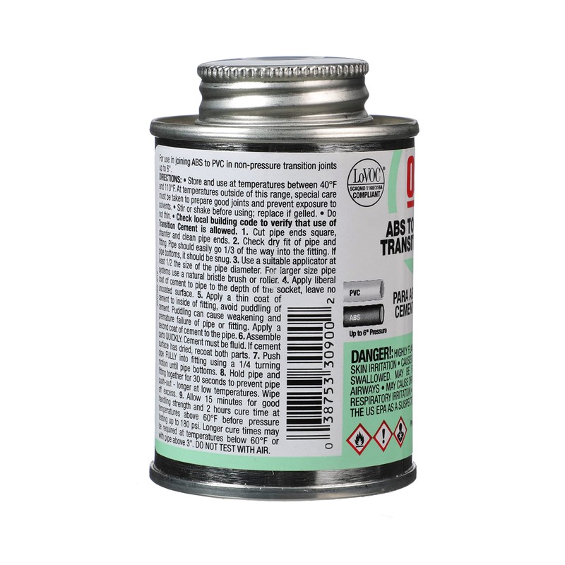 - Medium-Bodied Green colored cement for use in joining ABS to PVC in non-pressure transition joints up to 6-Inch diameter