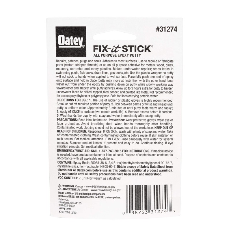 Oatey 31274 Stick Fix-It Multi-Purpose Epoxy Putty, 1.33 oz, White