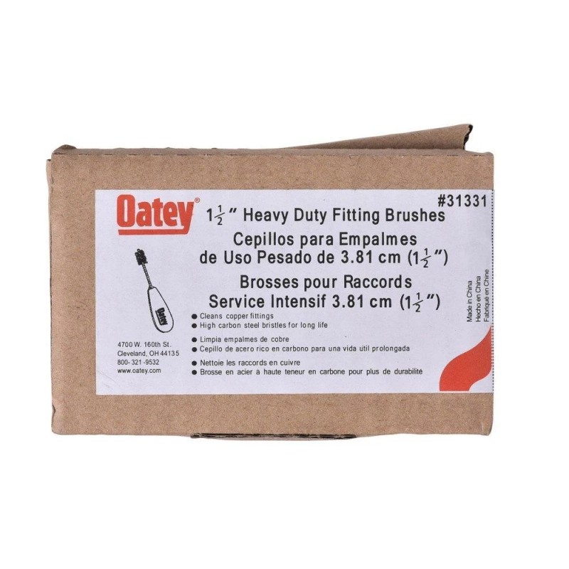 The Oatey 31331 is a 1-1/2 inch Fitting Brush designed to clean the insides of copper fittings before soldering. This tool features high carbon steel bristles which are effective at removing dirt and debris. A strong galvanized steel stem and a high-impact polystyrene handle provide durability and comfort during use.