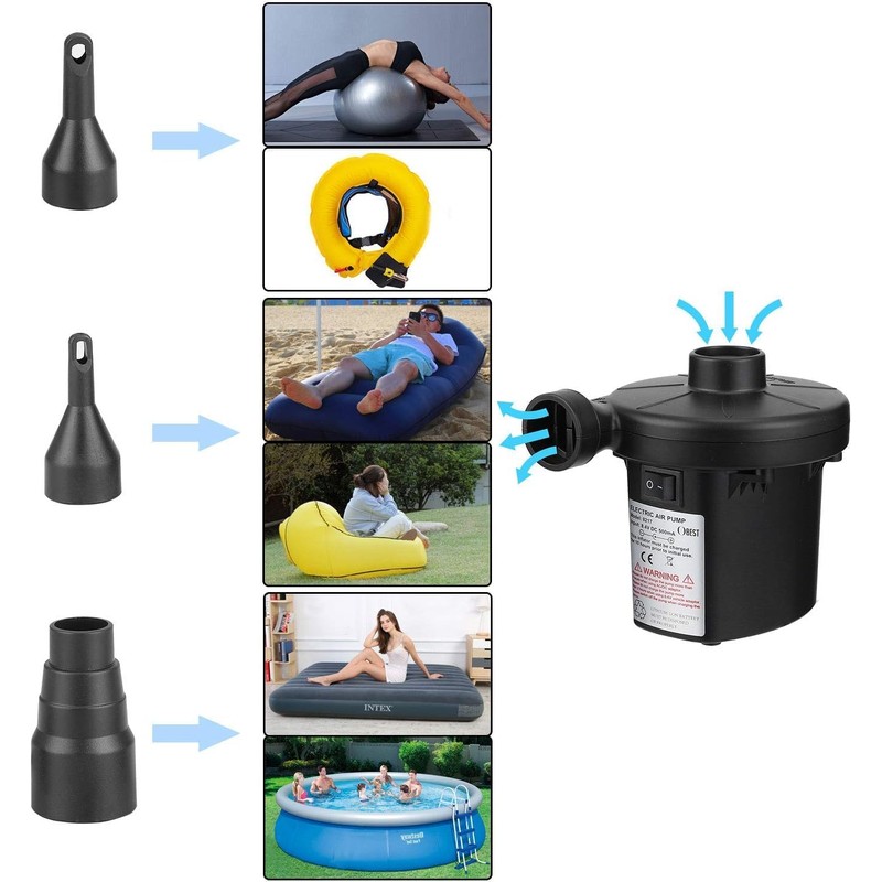 - 【3 Different Sizes of Nozzles】Battery Pump comes with 3 different size nozzles: S, M and L. The S size nozzle suitable for small inflatable products, such as swimming ring, inflatable pillow, etc. The M size nozzle suitable for inflatable lounger, inflatable pool seat and etc. The L size nozzle suitable for inflatable mattress and other large inflatable products.