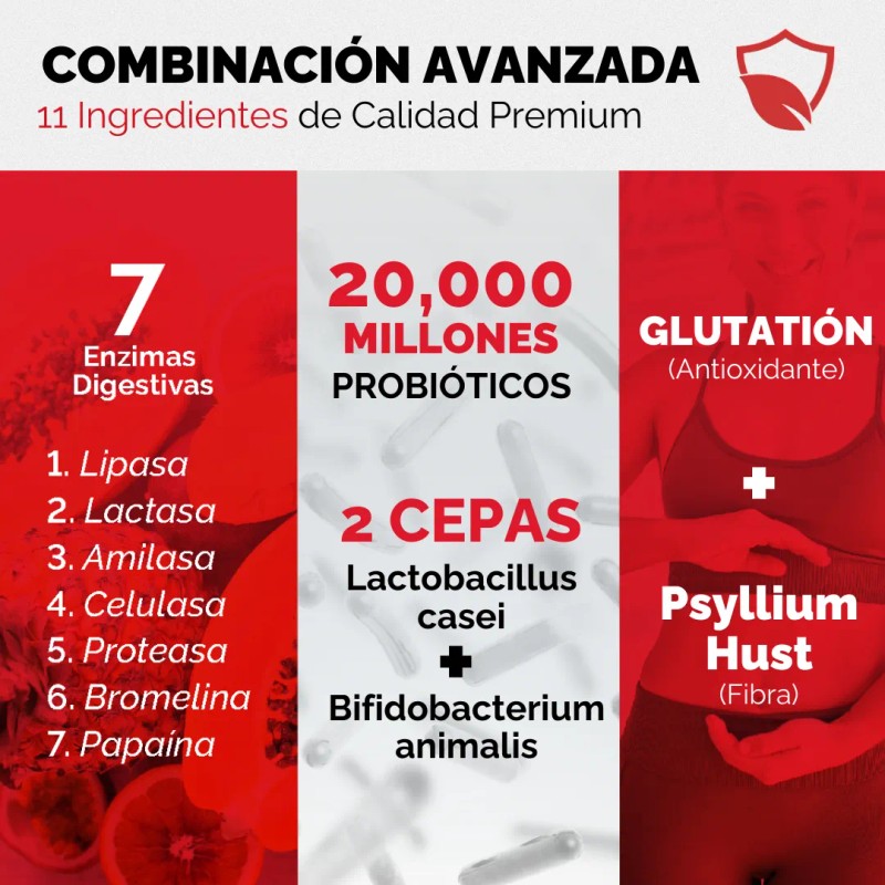 - Componente principal: 7 enzimas digestivas, 20 billones probióticos (2 cepas), glutation capsulas, fibra psyllium husk..