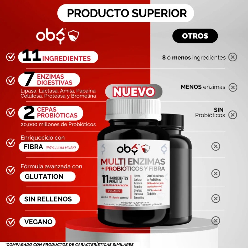 Las Enzimas Digestivas de Oby contienen en cada capsula 7 enzimas digestivas: Lactasa, Enzimas de Papaya o Papaína, Bromelina, Amilasa, Lipasa, Celulasa y Proteasa. También contienen 20 mil millones de probióticos Lactobacillus Casei y Bifidobacterium Lactis, Fibra Psyllium Husk, Glutation Antioxidante.