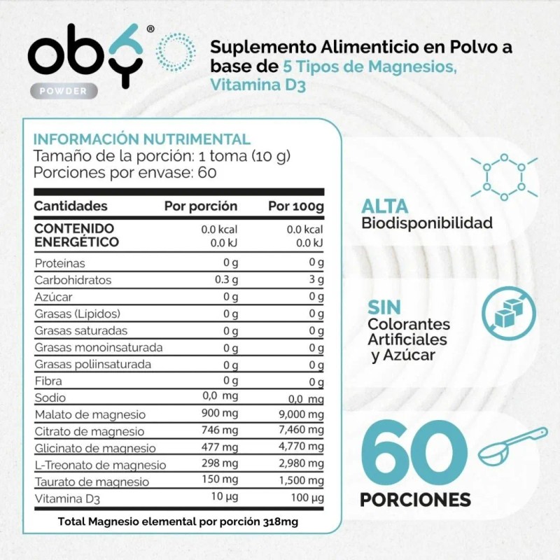 - Oby Multi Magnesios Complete: 5 tipos de Magnesios y Vitamina D3. Nuestra fórmula avanzada está diseñada para ofrecerte una excelente experiencia en suplementación de Magnesio, gracias a su presentación en polvo que maximiza la absorción y la biodisponibilidad de sus ingredientes. Pouch de 600 gr para 60 tomas, 10 gr de magnesio al día. FÓRMULA AVANZADA: 5 TIPOS DIFERENTES DE Magnesio: Citrato de Magnesio, Glicinato de Magnesio, L