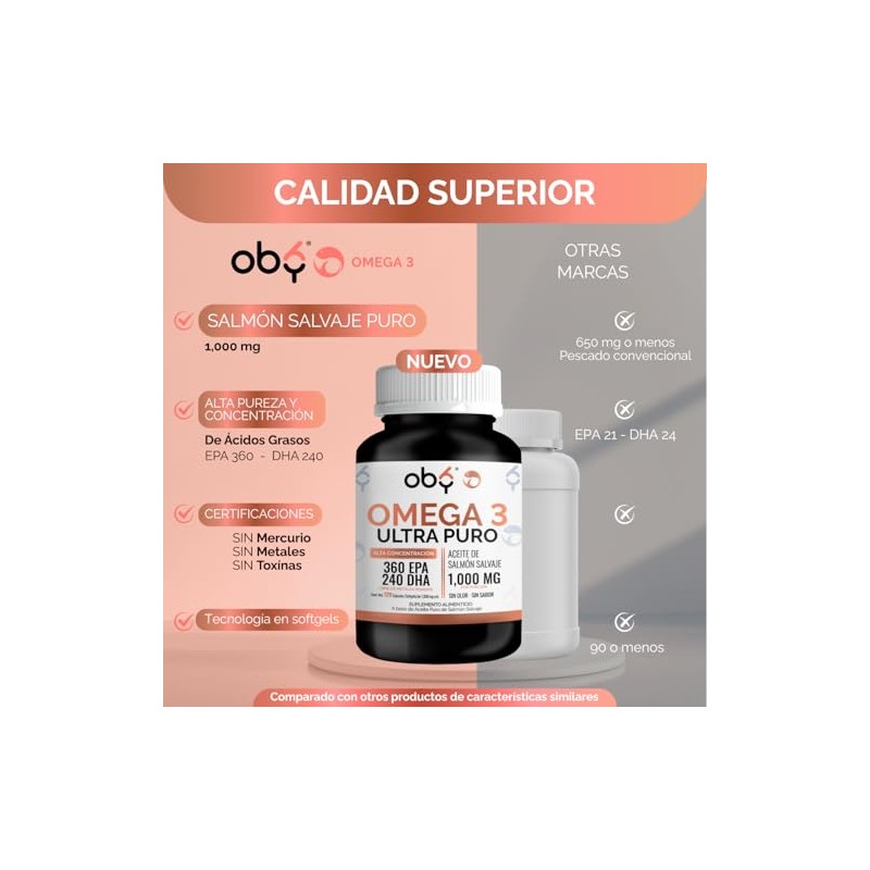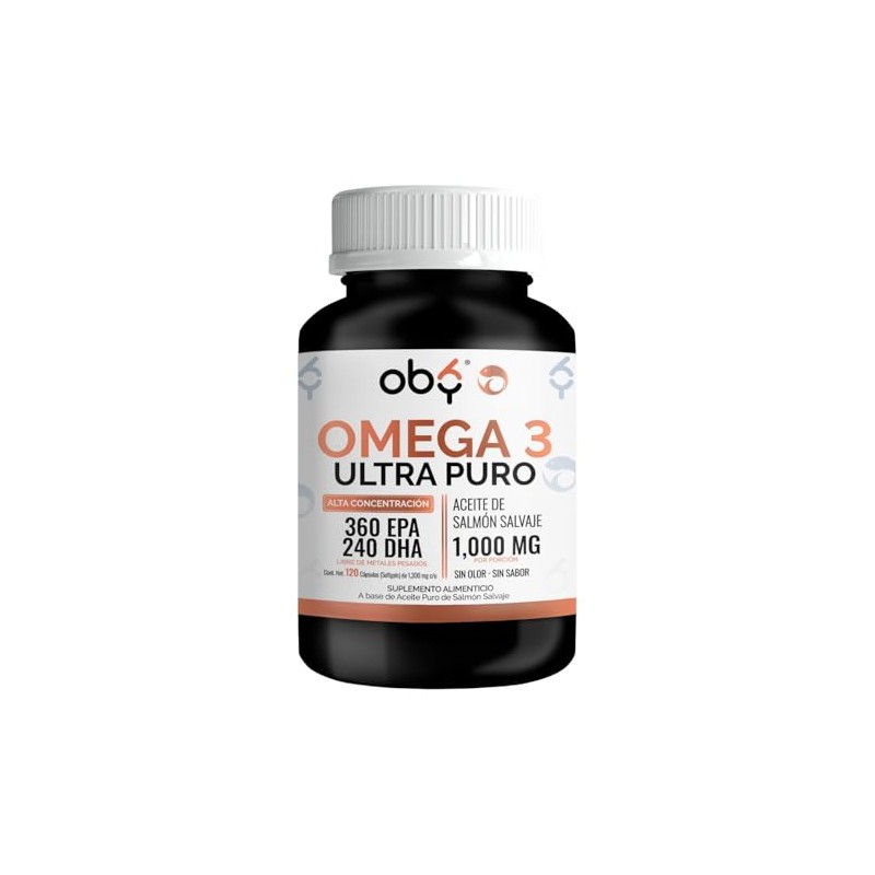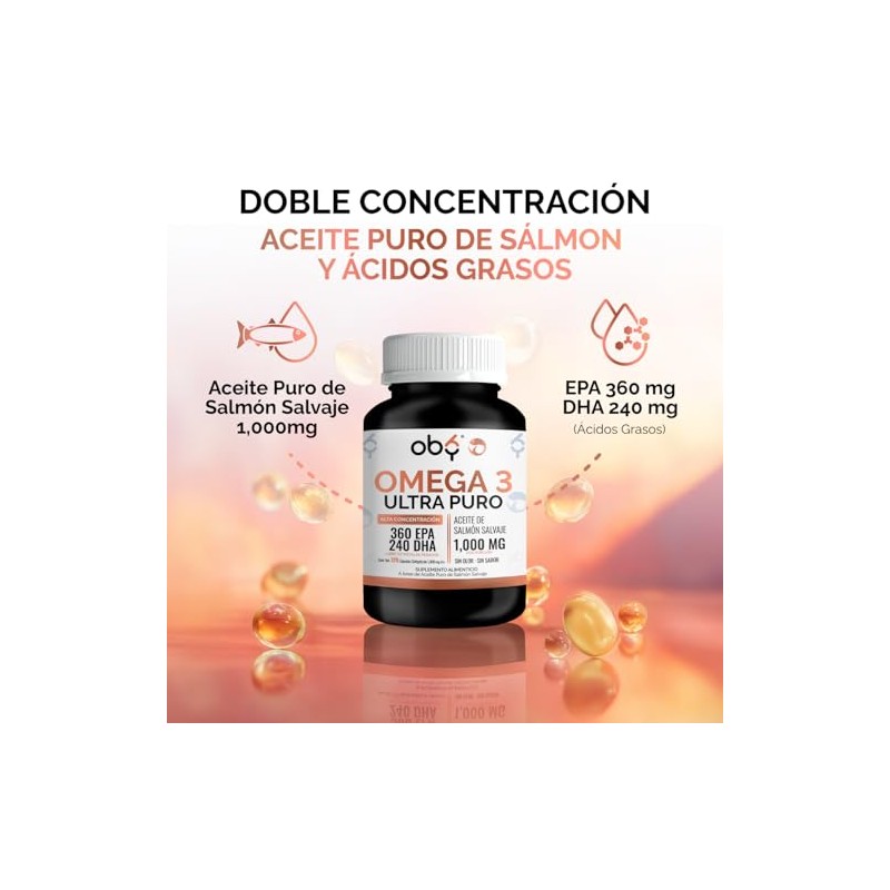 OBY Omega 3, 120 softgels de 1300 mg. Aceite Salmon Salvaje Puro Alta concentracion Omega 3 1000 mg DHA y EPA. Sin sabor y sin Olor