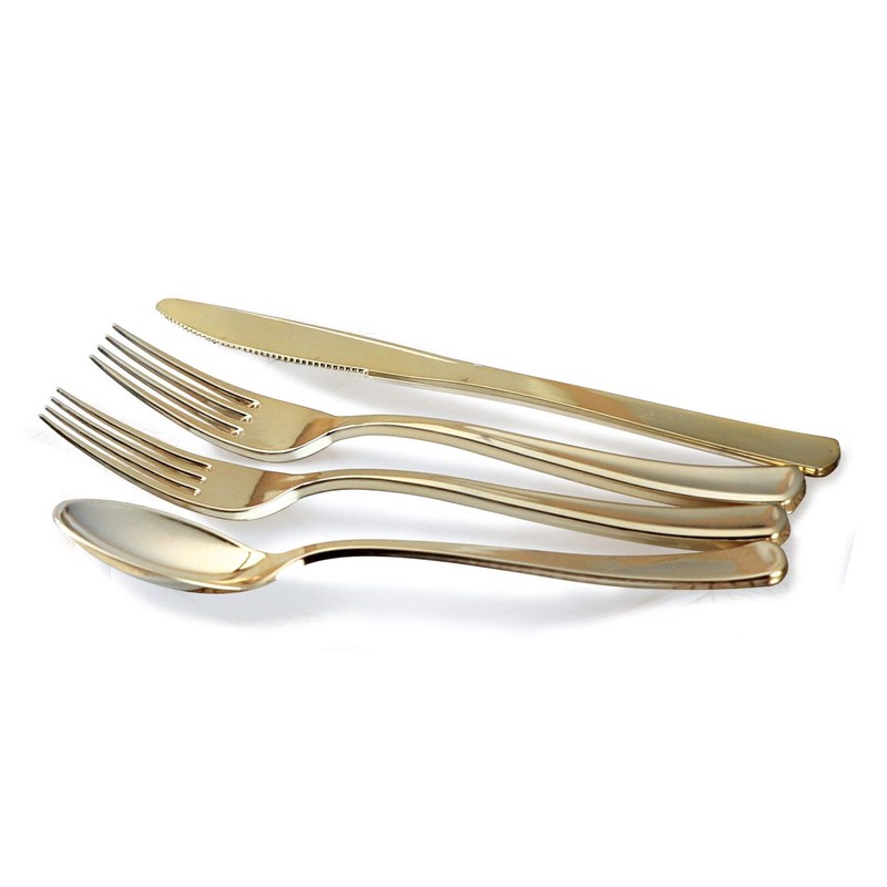 - 120 plastic forks, 60 plastic spoons, 60 plastic knives (Gold coated)