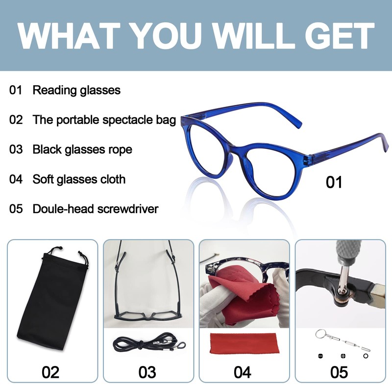 - Package :1 reading glasses.2 the portable spectacle bag and soft glasses cloth(to help protect your glasses from dirt, fingerprints and from breaking),3.black glasses rope 4 doule-head screwdriver, you tighten glasses frame.
