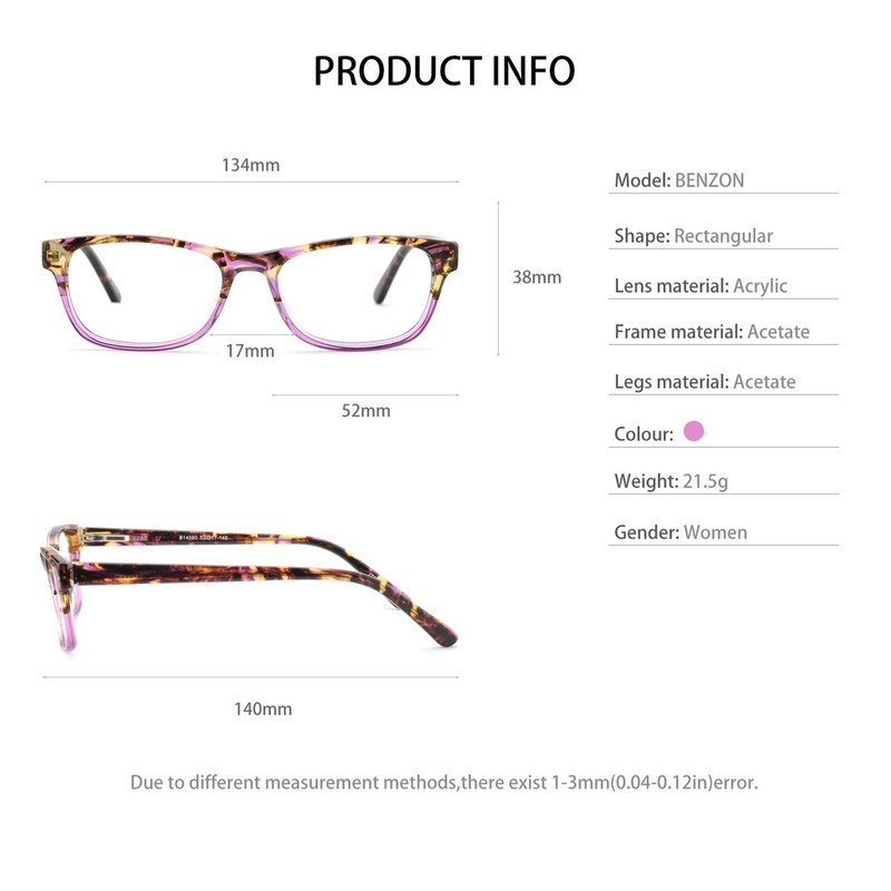 - CAUTIONS & MEASUREMENT: There is a transparent film on the lens. Before wearing, please tear it off so that you can see the clear lens!Lens width:52mm(2.05’’), Bridge:17mm(0.67’’), Arm:140mm(5.51’’), Frame width:134mm(5.28’’),Frame height:38mm(1.50’’).The stylish women’s blue light blocking reading glasses 3.5 comes from Italian acetate and features durable.
