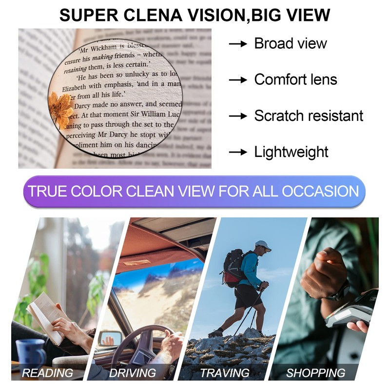 - CLEAR LENS/GOOD MAGNIFICATION :Made from acetate,is clear enough and easy to Clean.the wider lenses make it easier for you to read without moving your head ,and use them daily for small print reading,makes the vision clear,give you a very big and sharp view