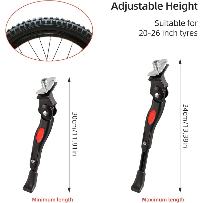 - Height adjustment: the bicycle stand offers an adjustable height from 30 cm to 34 cm and weighs only approx. 290g The height-adjustable rubber foot allows you to adjust the tilt of the parked bike individually and ensures maximum grip and stability on different surfaces.