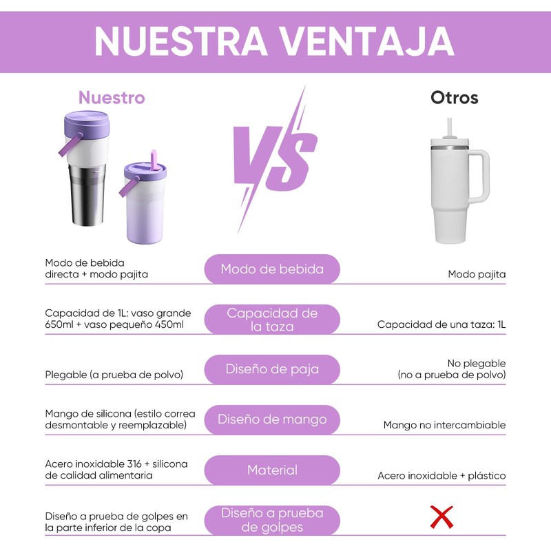 - ¡TAZA DOBLE Y DISEÑO DE DOBLE TAPA: Esta termo de acero inoxidable 1 litro es el diseño más singular es desmontable en dos tazas al mismo tiempo, parece sólo 650ML tamaño, pero la capacidad real de 1,1 L, se puede disfrutar de la última sensación de café helado, al mismo tiempo se puede disfrutar de una taza de leche espesa estómago caliente, y, usted puede experimentar el placer de usar una pajita para beber pequeños sorbos de agua, pero también puede experimentar una gran boca directamente a la bebida! Felicidad