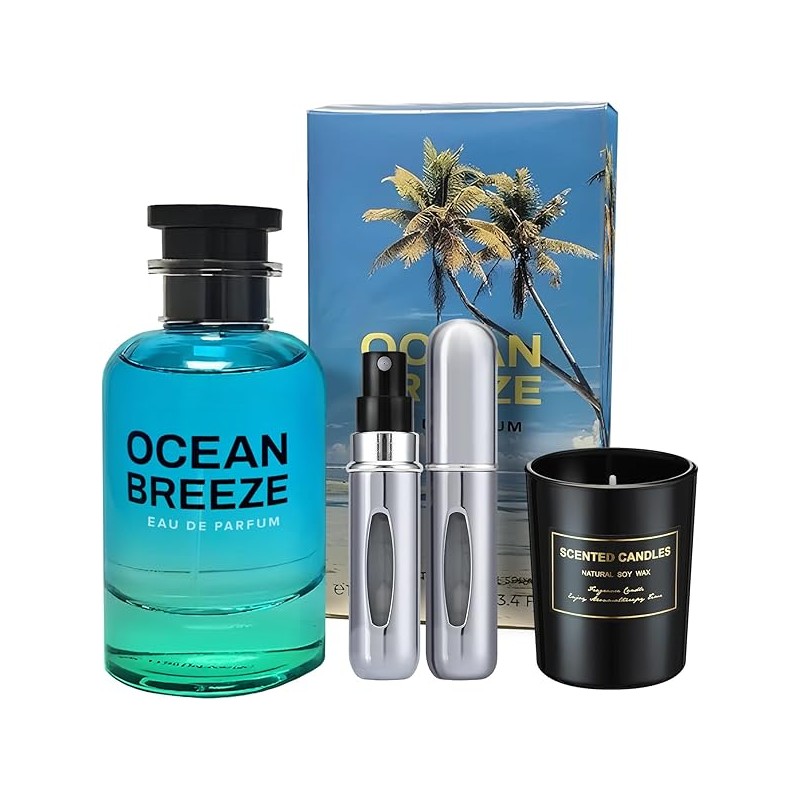 Ocean Breeze Perfume - Eau de Parfum 3.4 oz - Gift Set Pack with Scented Soy Candle and Empty Travel Perfume Atomizer