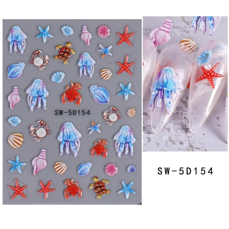 Ocean Nail Designs 5D Embossed Seashell Nail Stickers 3D Self-Adhesive Blue Starfish Summer Nail Decals with Designs Purple Jellyfish Coral Nails Manicure Accessories for Women 5 Sheets