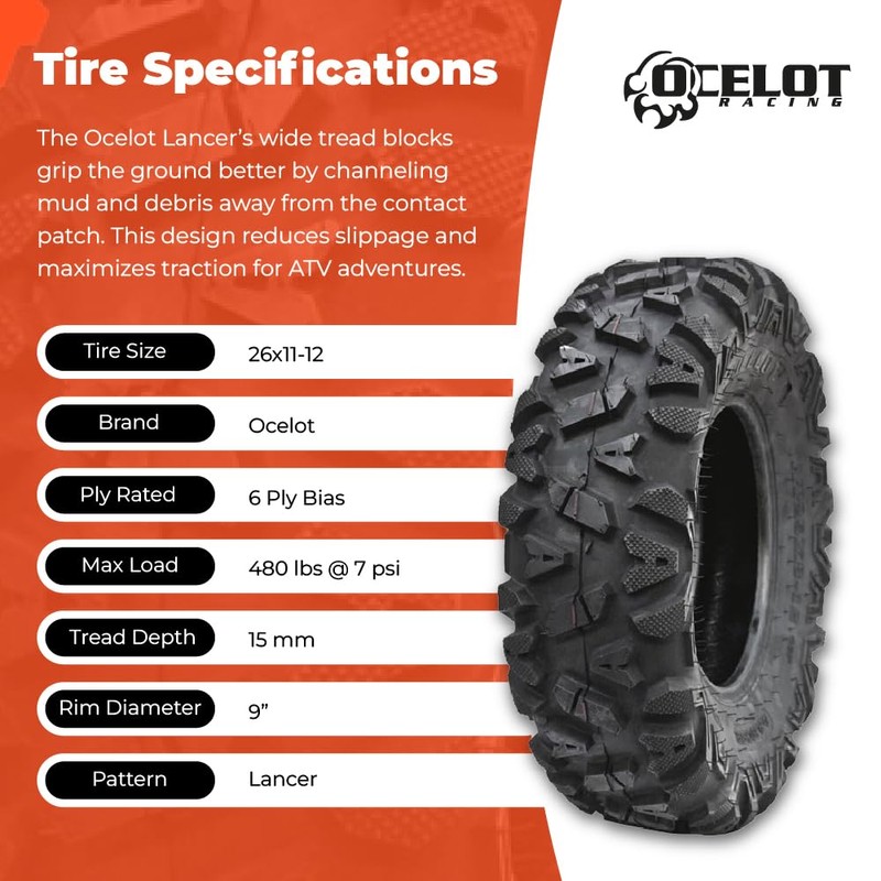 Ocelot Lancer ATV/UTV Tires for Recreational Riders & Racers, Lightweight & Durable 6-Ply Bias Construction ATV Tires, Wide Footprint 4 Wheeler Tire w/Large Shoulder Lugs, 26 x 11-12 ATV Tire