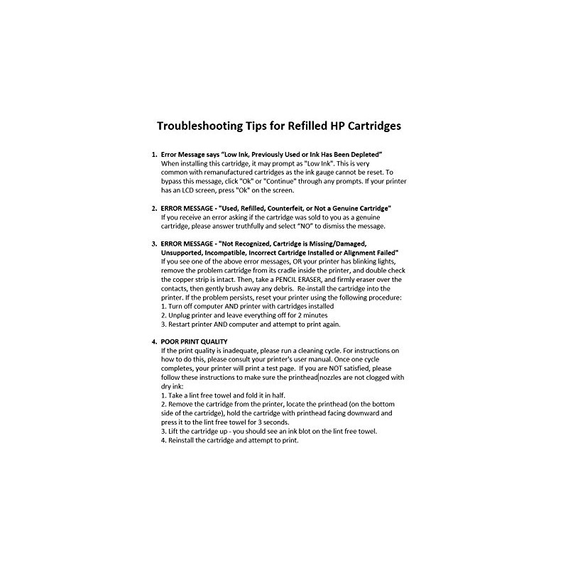 - LOW INK WARNING - When installing this cartridge, it may prompt as "Low Ink, Previously Used or Ink Has Been Depleted". This is very common with remanufactured cartridges as the ink gauge cannot be reset. To resume printing, click "Ok" or "Continue" through any prompts. If your printer has an LCD screen, press "Ok" on it.
