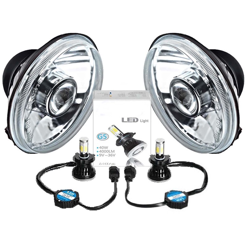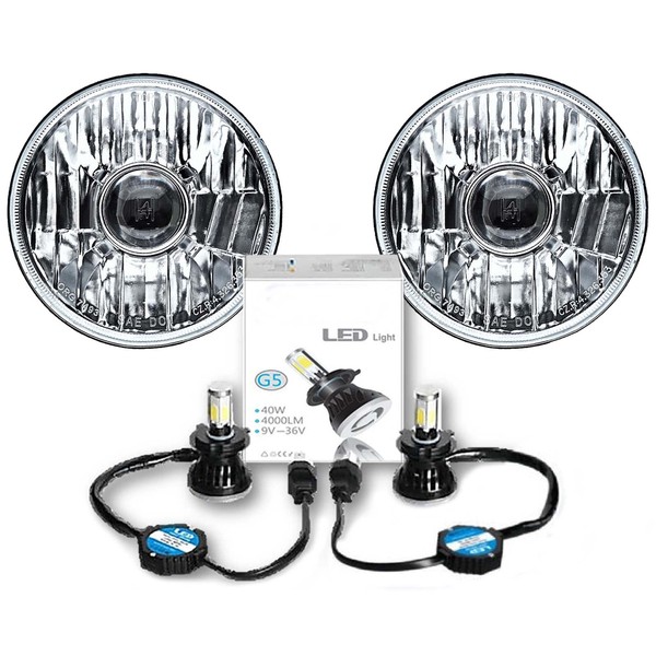 Pair Of 5 3/4 inch Projector Crystal Clear Glass Lens - Metal Back Headlight Bulbs. This Set Includes (2) Low/High Beam Headlights With High Intensity Led Light Bulbs (No Wiring Or Bucket Modification Needed).