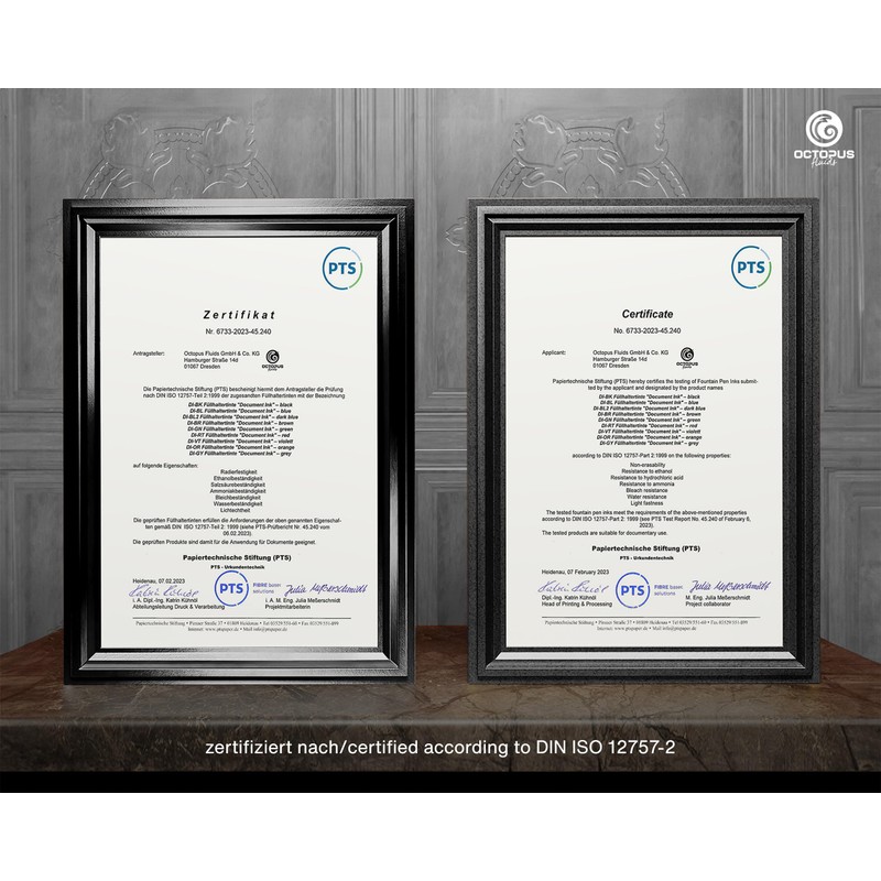 The independent Institute PTS - Paper Technology Foundation Heidenau has examined all 9 colours for the aforementioned properties and their fulfilment according to DIN ISO 12757-2 certified. The inks thus meet the requirements of the service regulations for notaries (DONot), requirements of the state ministries of justice, the federal budget regulations, the service instructions for the civil registry office and the requirements of the Federal Medical Association in Germany.