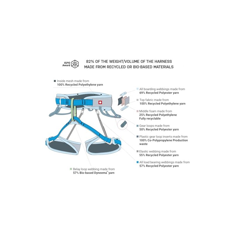 - MOVABLE WAIST SYSTEM: A sliding belt system where the main load-bearing strap runs freely through a tunnel in the padding, ensures a perfect fit and that the belay loop and gear loops are always properly centered.