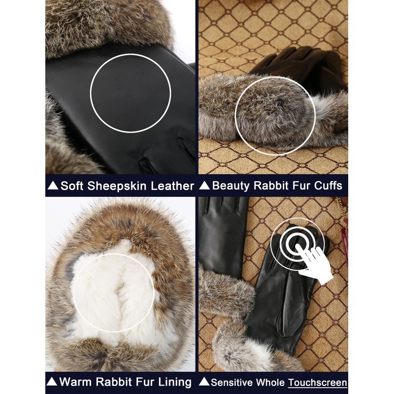 OCXMME Super Warm Womens Rabbit Fur Lined and Cuff Leather Gloves for Women Touchscreen Texting Driving Gloves Black Large