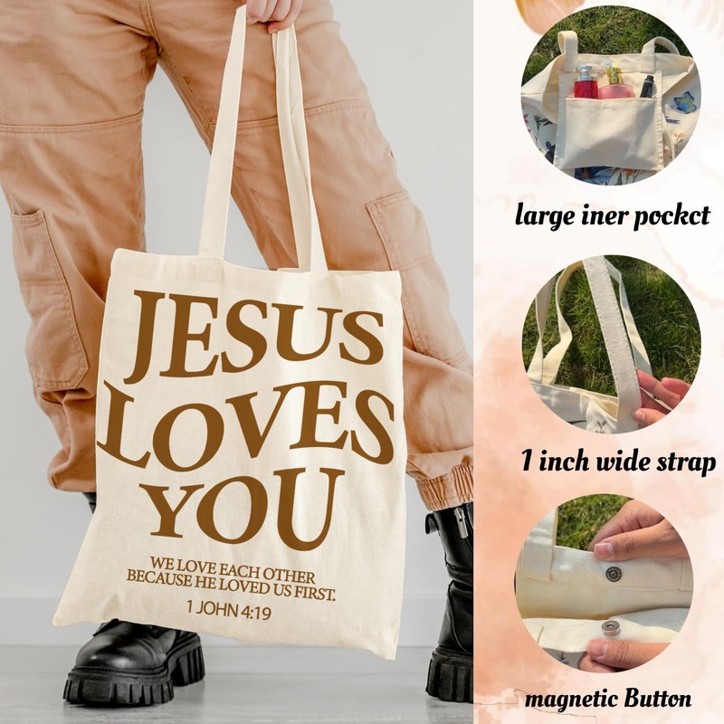 Odebyata Christian Gifts Tote Bag, Bible Verse God Jesus Light Brown Canvas Shopping Bag for Reader Besties Girl Friend Daughter Mom Grandma Grocery Shoulder Bag (Jesus B)