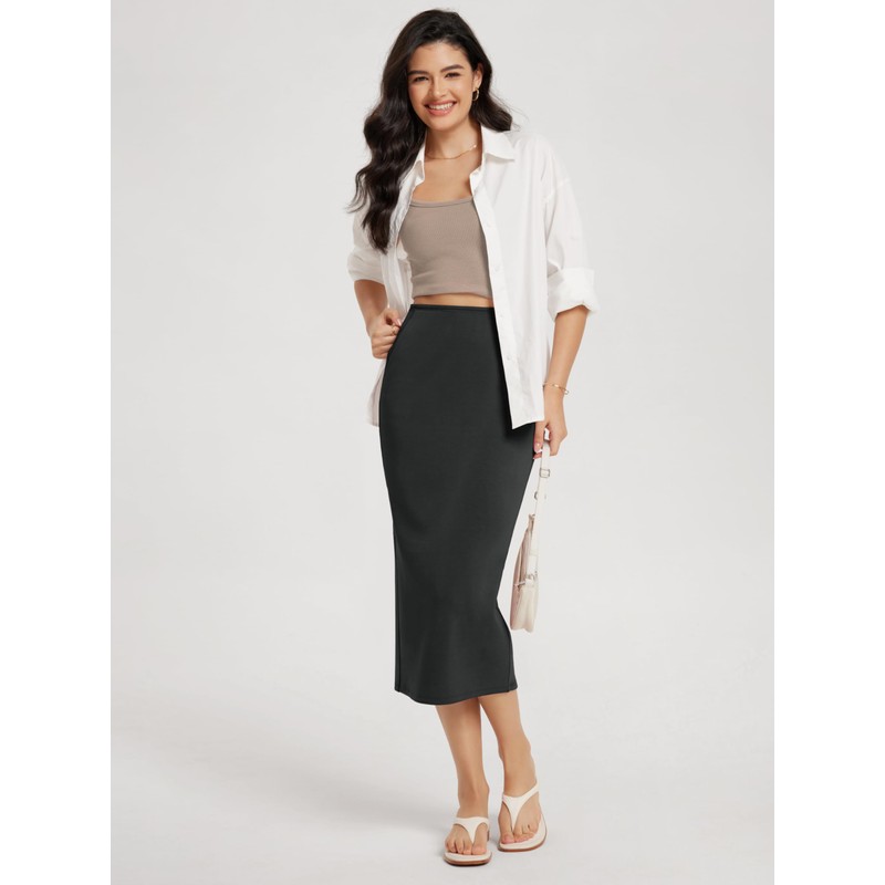 - Back Split: The midi length and back slit hem offer ease of movement while adding a flattering highlight to the leg line.
