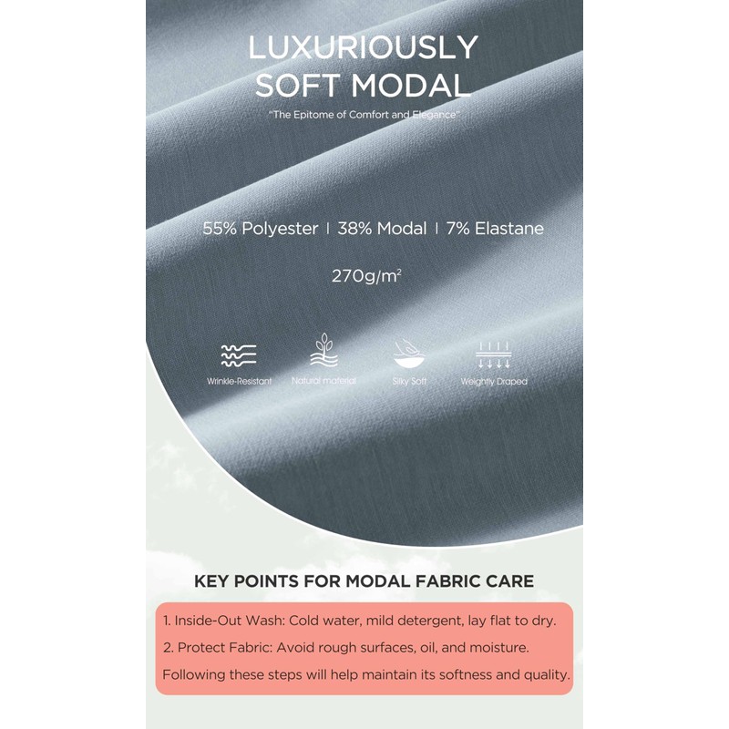 - Modal Soft: Made of ultra soft modal fabric blend with polyester and spandex, 270g/m² medium weight fabric, weightly draped, moisture absorption and wrinkle-resistant, keep the shape of the tops well.