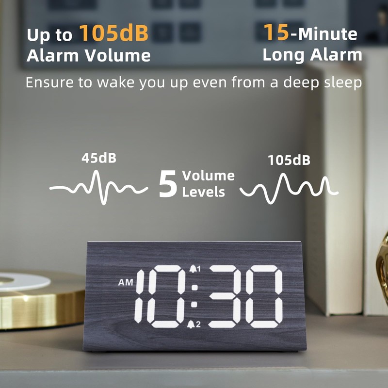 The alarm clock features a 5-level customizable volume range from 45dB to 105dB, suitable from very low for light sleepers to extra loud for heavy sleepers. The alarm lasts for 15 minutes, ensuring you wake up even from a deep sleep.