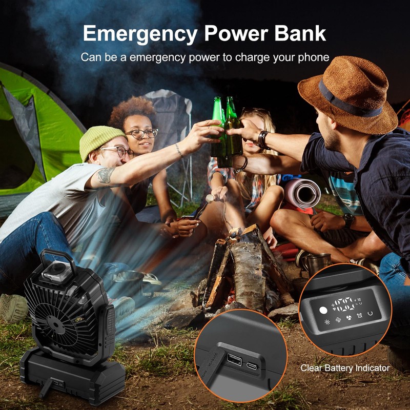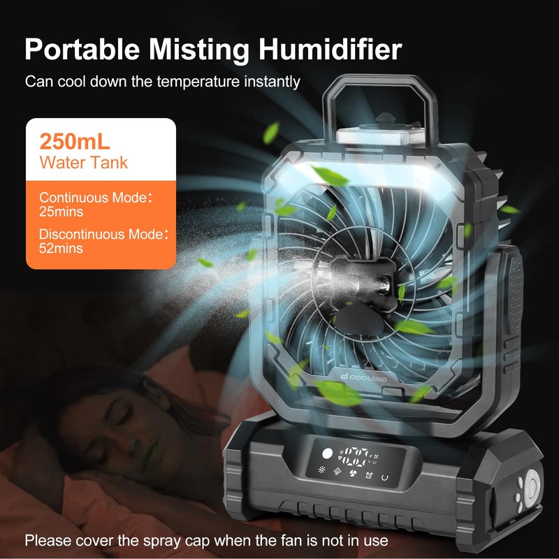 Odoland Odoland Portable Misting Fan with Light, 30000mAh Rechargeable Battery Cooling Camping Fan with 2 Spray Mister, USB Tent Fans with Hook for Outdoor, Hiking, Patio, Travel, Beach, Black
