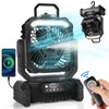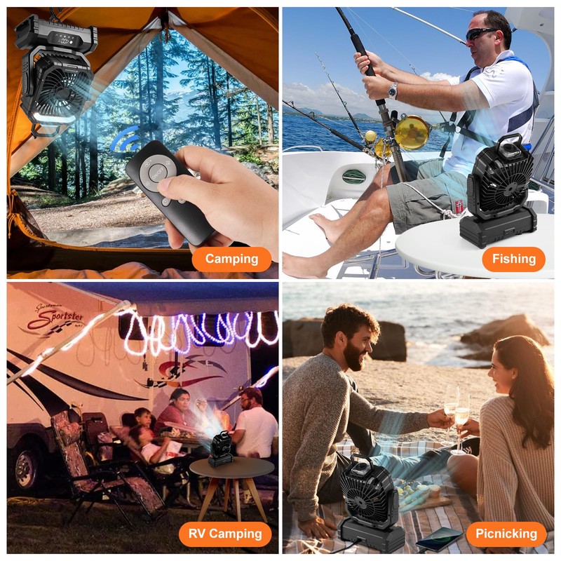 - 90Automatic Oscillation and 270 SwivelOur portable fan has a 90automatic swing and a 270 swivel head. With a remote controler that allows you to easily operate within 16ft. Ideal camping gear and survival kit for car RV, hiking, Picnic, BBQ.(Note: long press the "Rotate" button can turn off the buzzer)