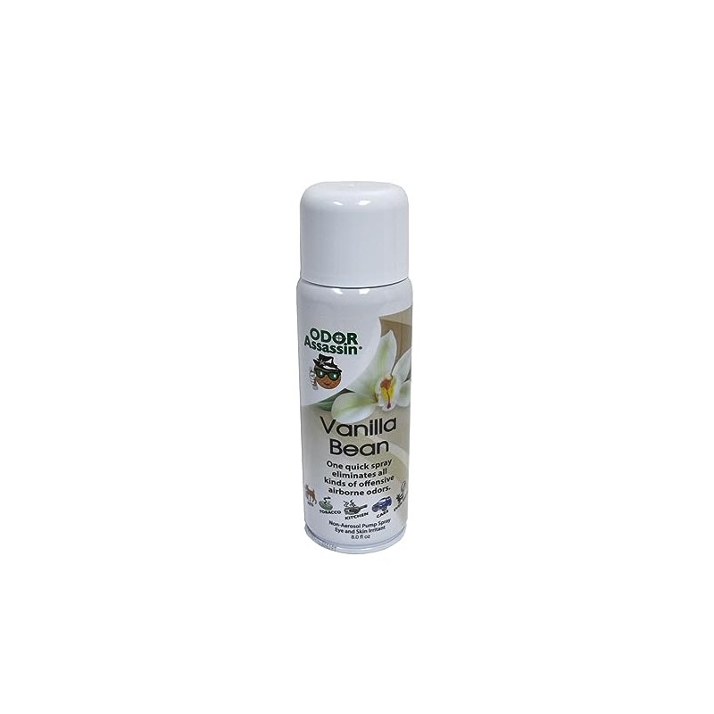Odor Assassin Odor Eliminator Vanilla Bean Scent. Odor Assassin Odor Eliminator. Eliminates Odors Such As: Tobacco Smoke, Pet Odors, Cooking Oils, Sick Rooms, Bathroom Odors, Trash Containers, Basements, Laundry Areas. 1,500 Sprays In Each 8oz Can. 100 Percent Active Odor Eliminator. Even Beats Skunk Odor. Vanilla Bean Scent. SC-32-0138-07 RO-115042
