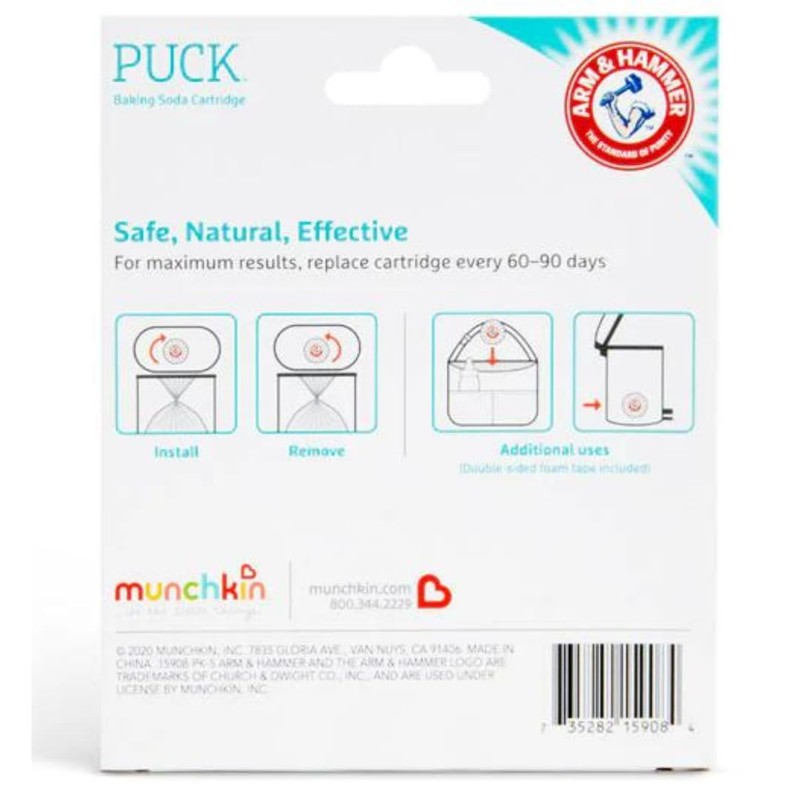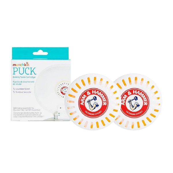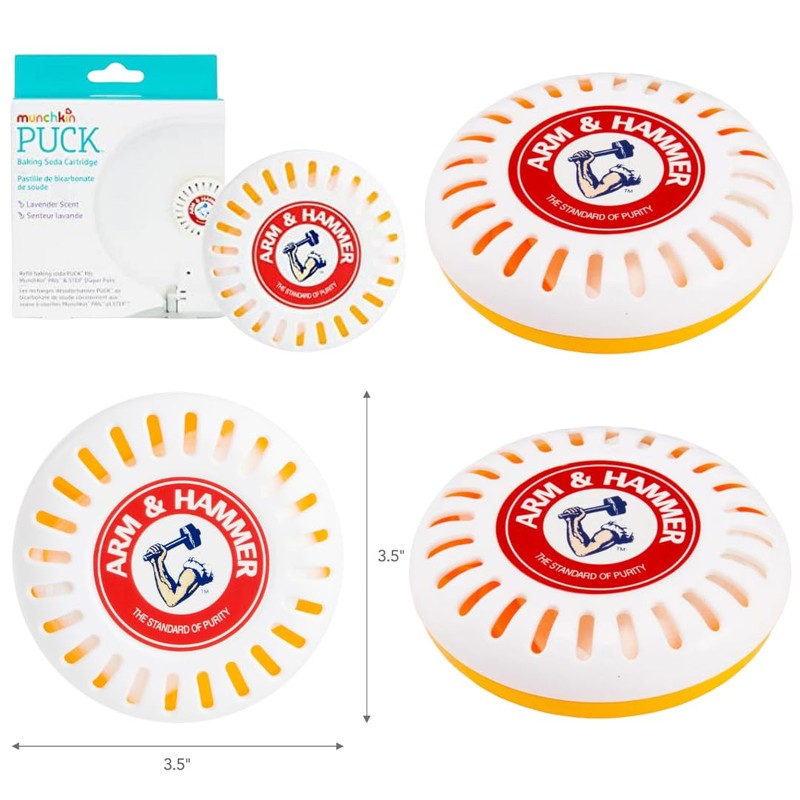 Keep your nursery or diaper changing area fresh and odor-free with the Munchkin Arm & Hammer Puck Baking Soda Cartridge 4 Pack. These pre-filled discs are designed to work seamlessly with Munchkin diaper pails, releasing a pleasant lavender scent while effectively eliminating unpleasant odors. Made with Arm & Hammer baking soda, a trusted odor eliminator, these cartridges help neutralize tough diaper smells, ensuring a clean and comfortable environment for your little one. Simply place the discs in the designated compartment of your Munchkin diaper pail and let them work their magic. With a pack of four cartridges, you'll have a continuous supply of freshness for an extended period. Keep your spaces smelling fresh and inviting with the Munchkin Arm & Hammer Puck Baking Soda Cartridge 4 Pack.