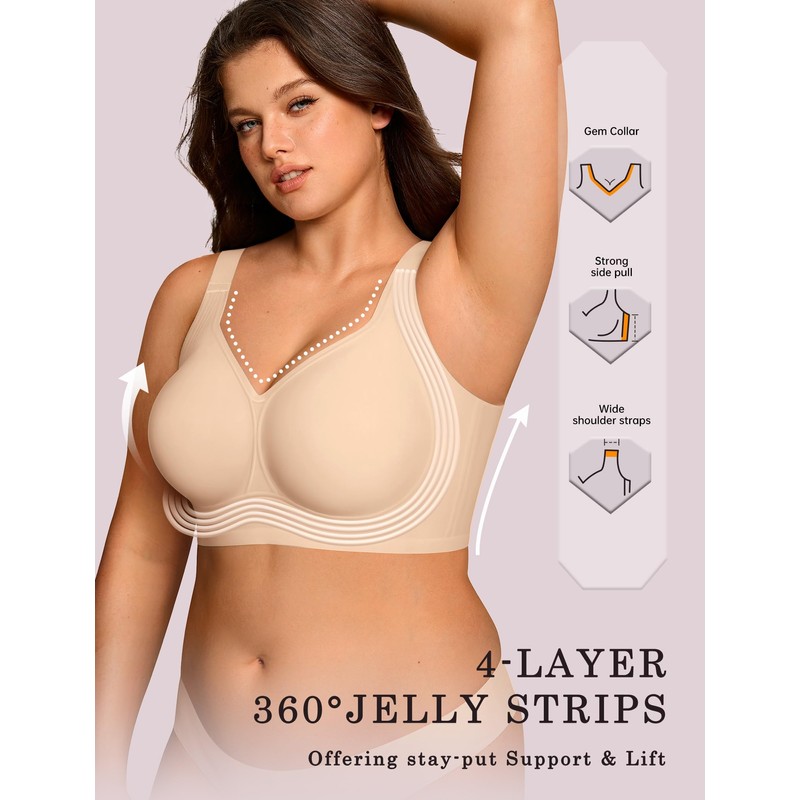 - Full Coverage Bras No Underwire - The V neck Bras Designed with no wire to provide a natural relaxed fit while offering great support through 360° jelly strips, ensuring all day comfort. Lightweight bras keep skin cool and dry. The widened elastic band stays securely in place without rolling or shifting, ensuring stability during movement. A perfect combination of freedom and support for everyday wear.
