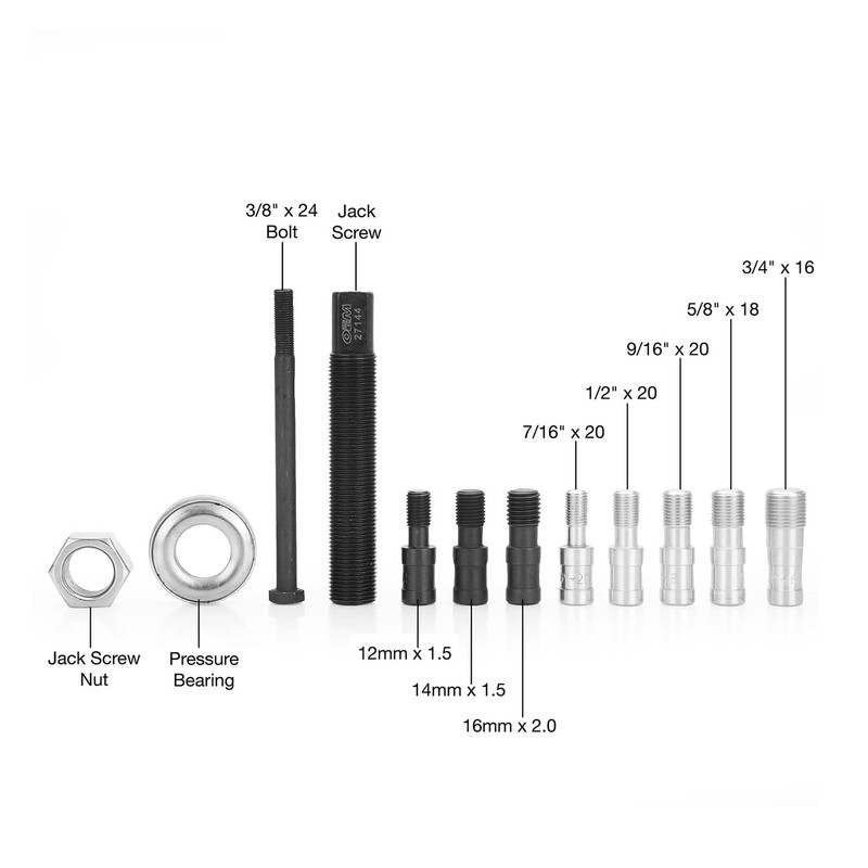 - Harmonic Balancer Installer: Tool set includes a jaw screw, a jack screw nut, a pressure bearing, a 3/8 inch x 24 bolt, and 9 thread adapters