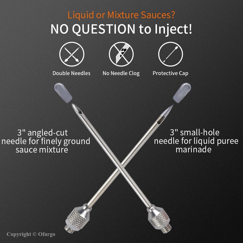Turkey injector needle is solid, designed for avoiding clogged, weak suction, bottom leak, broken; ultra-sharp to pierce the toughest cuts of meats or poultry.