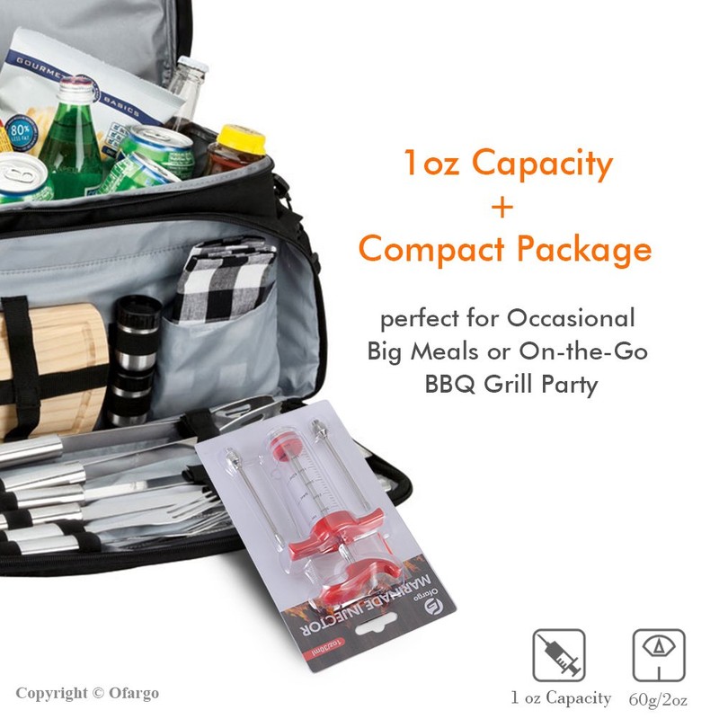 - Lightweight, Compact Package, Portable for Party--super lightweight (0.13lbs/60g=an egg) turkey injector syringe kit; ultra compact package (Slide Card), easy to put into your backpack/storage bag; all in portable package, easy to carry for party activities: indoors cooking, holiday dinners, baking, toasting, roasting, and outdoors BBQ, bonfire smoked grill