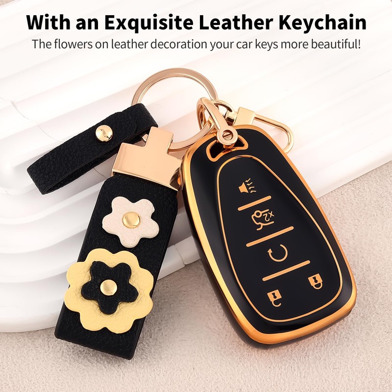 OFF WE GO for Chevy Key Fob Cover with Leather Kechain, Soft TPU Key Fob Case for Chevy Malibu Traverse Equinox Cruze Sonic Volt Spark Bolt Blazer Camaro Impala Trax Tahoe (Gold Black)