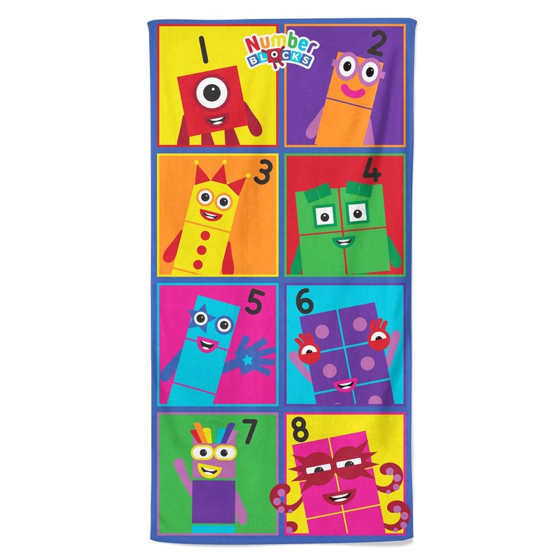 - NUMBERBLOCKS: What happens when numbers come to life? Every day is an adventure with the Numberblocks. The adventures of ten friends, in Numberland who can always count on each other! Your little one is sure to love seeing this colourful beach towel. Featuring all the original numberblocks from 1-8, now your little one can count along whilst watching the preschool favourite on cbeebies or perfect to take swimming or for a trip to the beach.