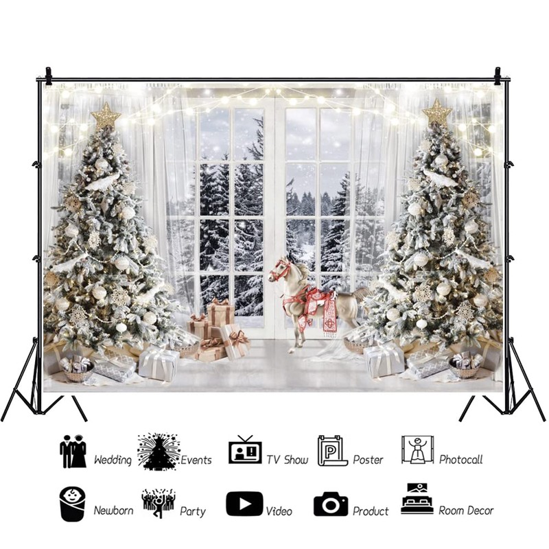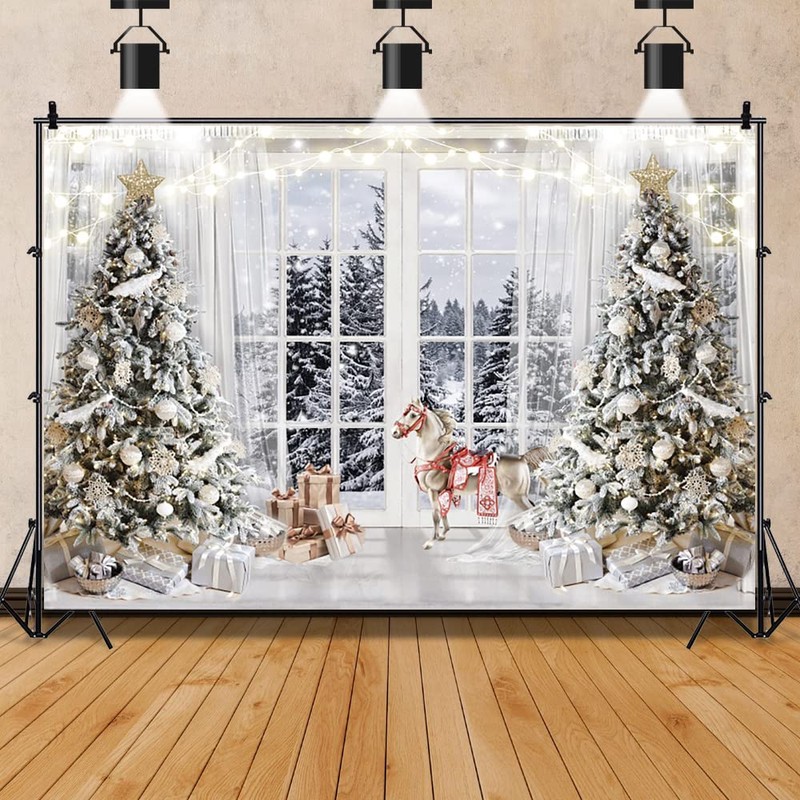 OFILA Christmas Window Backdrop 10x8ft White Christmas Backdrop for Photography Xmas Trees Glitter Lights Snowy Forest Background Merry Christmas Party Decor Banner Portrait Photoshoot Booth Props
