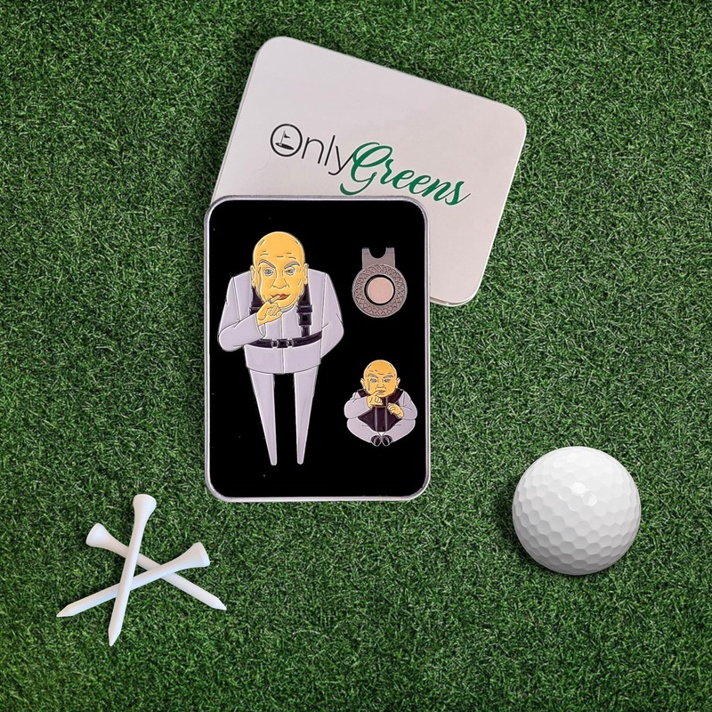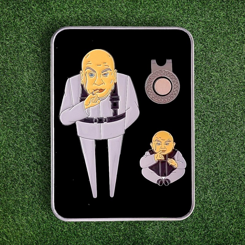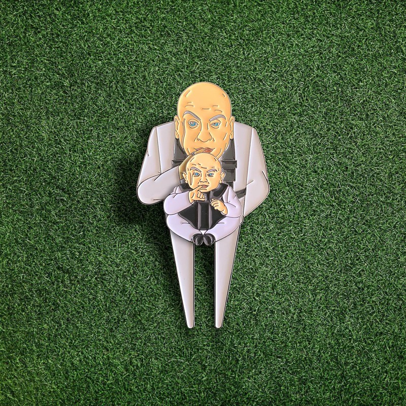 Step onto the green with a touch of classic comedy with this unique Dr. Evil & Clone Caddy Divot Tool and Ball Marker Set. Perfect for golf enthusiasts and film buffs, this set is a must-have addition to your golfing gear.