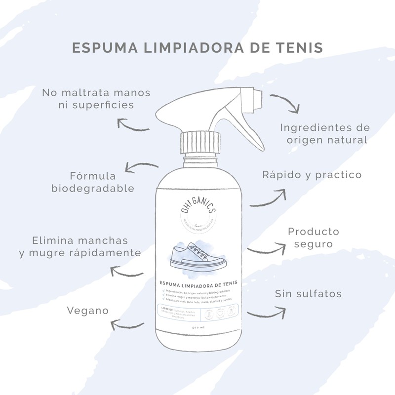 - Incluye: Espuma Limpiadora de Tenis 500 ml, Limpiador de tenis 100 ml, Cepillo de calzado con cerdas de nylon