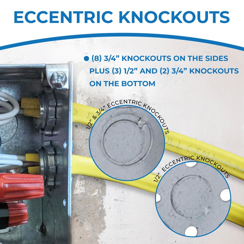 - Improved Design: Raised ground emboss box have eight 3/4" knockout holes on the sides and three 1/2" and two 3/4" knockout holes on the bottom.