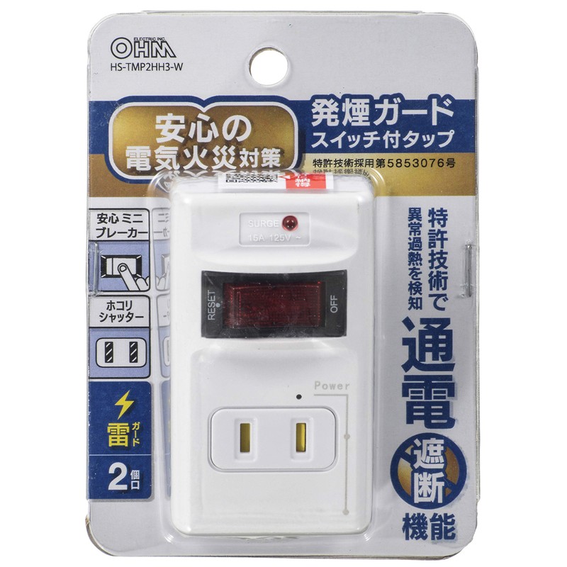 オーム(OHM) 電機 雷ガード付 発煙ガード スイッチ付タップ(2個口) HS-TMP2HH3-W