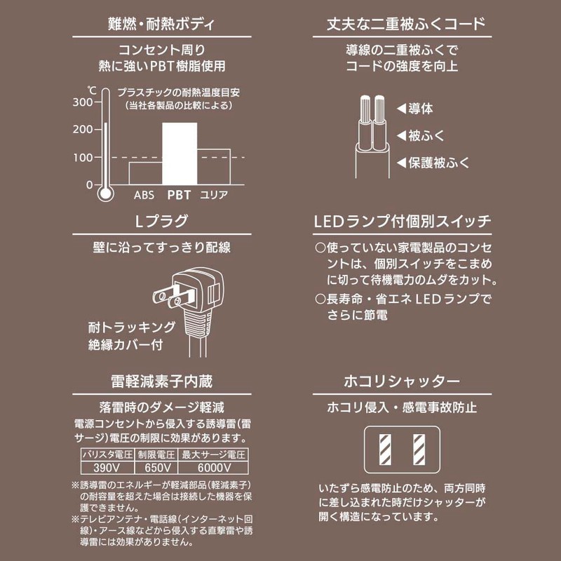 - Features: Power tap with lightning guard to protect precision equipment from thunder; Built-in lightning reduction element reduces damage during lightning striking; Individual switch with LED lamp to reduce power saving countermeasures from heat-resistant PBT resin around the outlet; Durable double coated cord; L-type plug creates clean wiring along the wall. Includes dust shutter to prevent dust from entering. Shutter opens only at time. Tamper-resistant construction